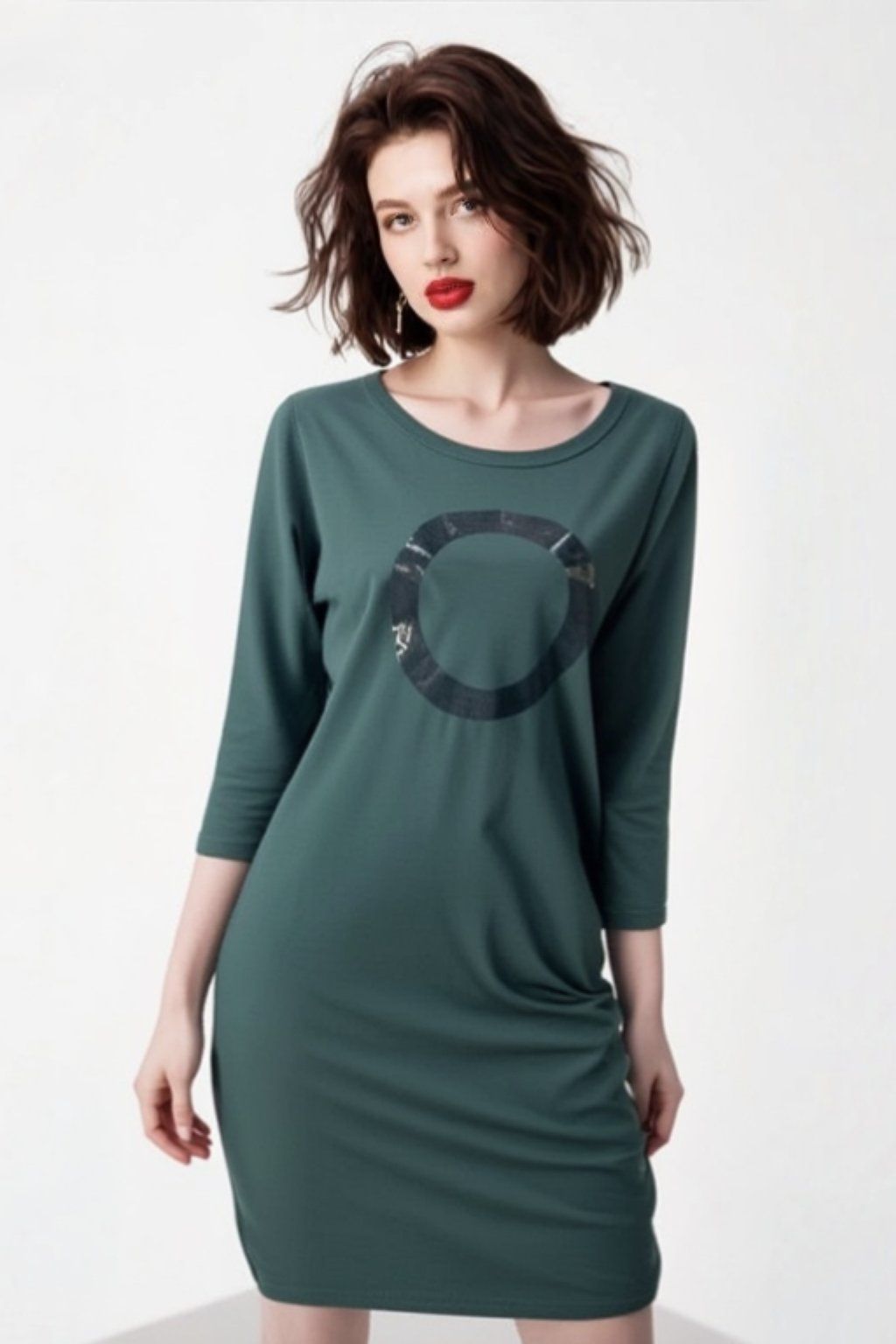 Potisk GLITTER se hodí se na slavnostnější chvíle a dodává šatům punc vyšší elagance. Šaty jsou rovného střihu, stejně široké v prsou a v bocích. Lodičkový výstřih. 3/4 rukáv. Boční kapsy.