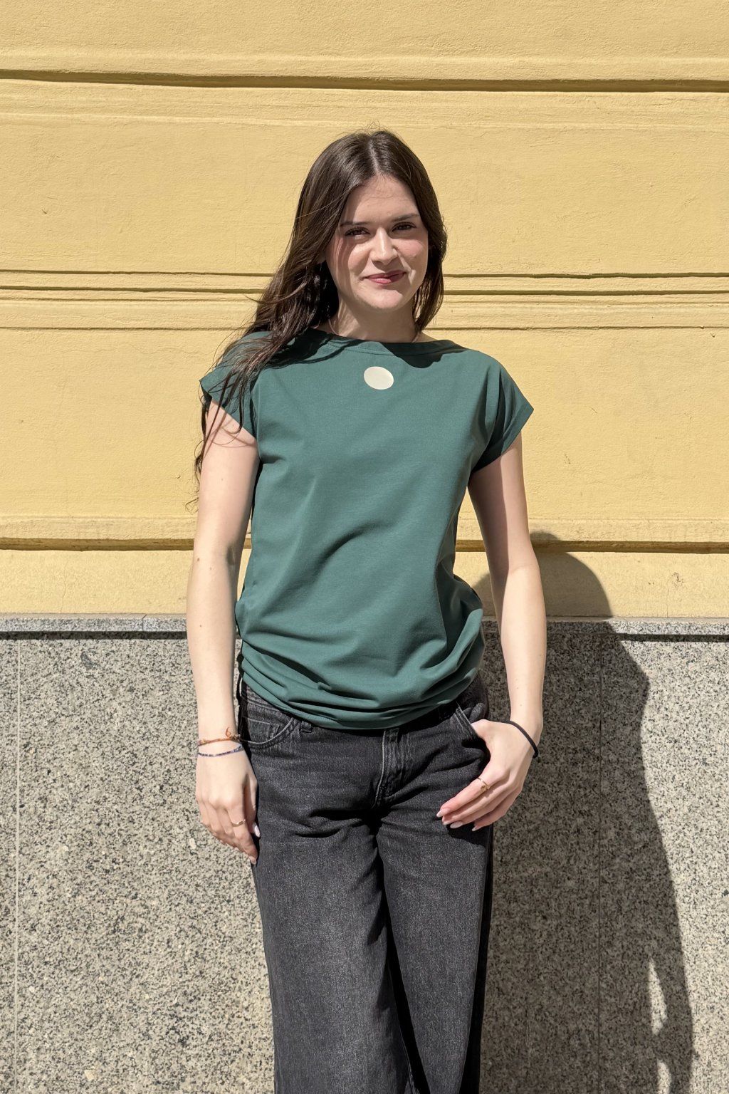 Triko je uzké, v bocích víc zúžené, spadlý rukáv. Lodičkový výstřih.