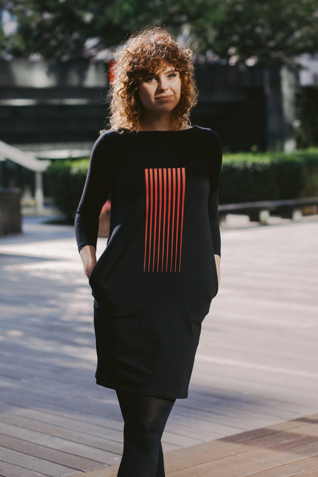 Šaty jsou rovného střihu, stejně široké v prsou a v bocích. Lodičkový výstřih. 3/4 všívaný rukáv. Boční kapsy.