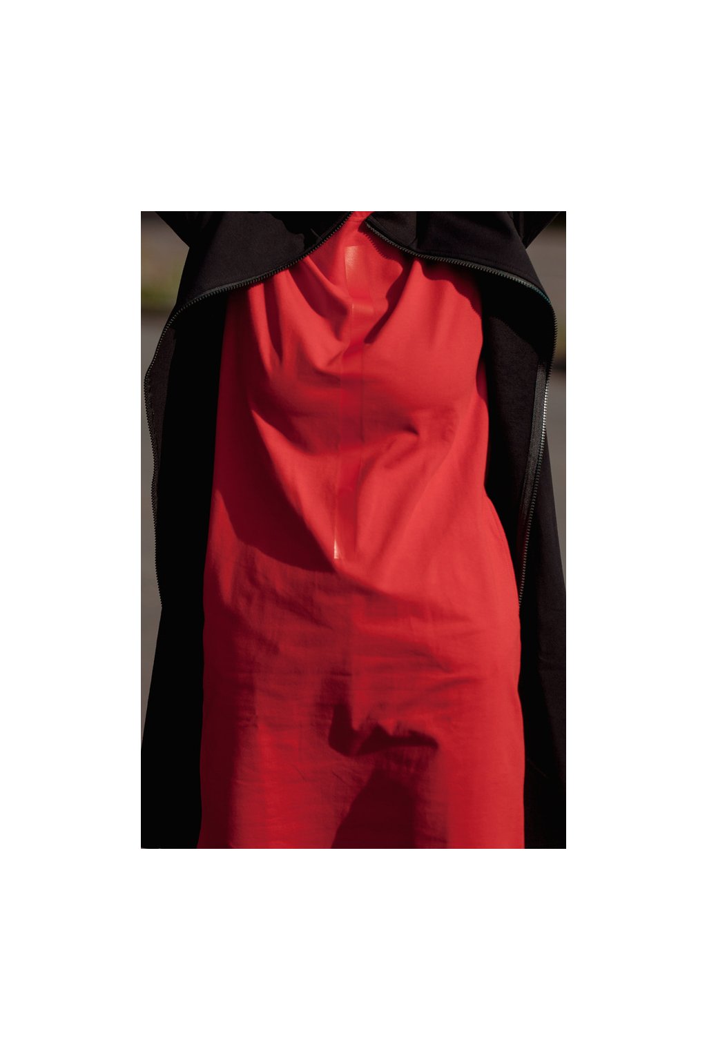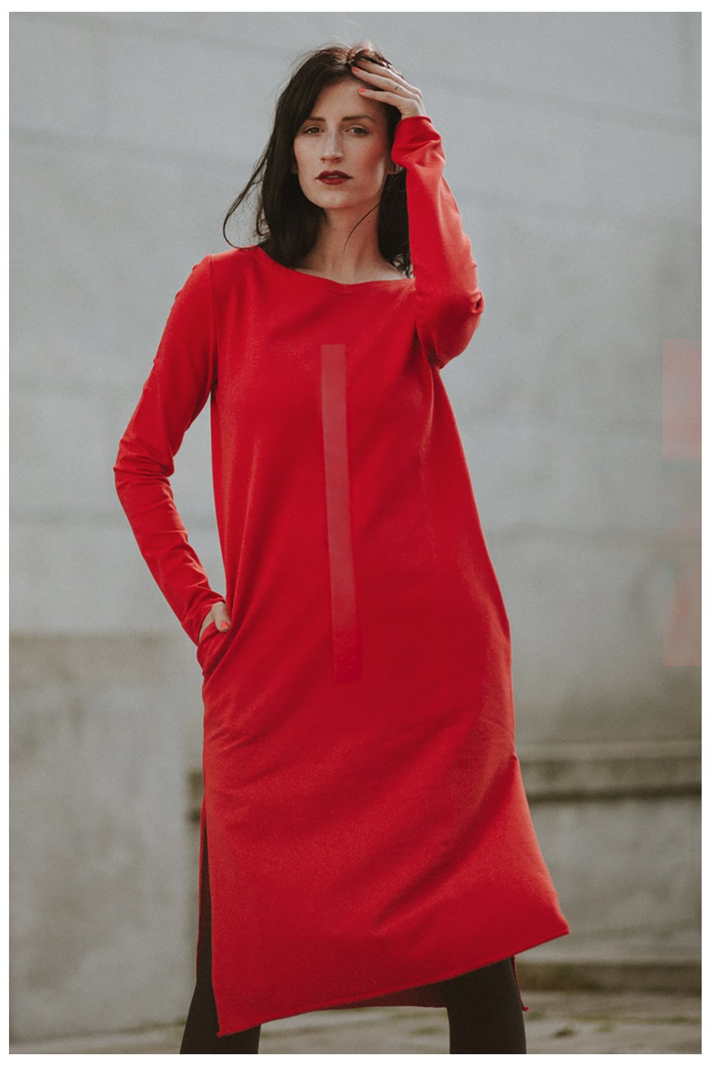 Šaty jsou rovného střihu, stejně široké v prsou a v bocích. Od boků dolů se mírně zužují a nechají tak vyniknout ženské siluetě. S lodičkovým výstřihem a dlouhým rukávem. Rozparky po stranách. Beoční kapsy.