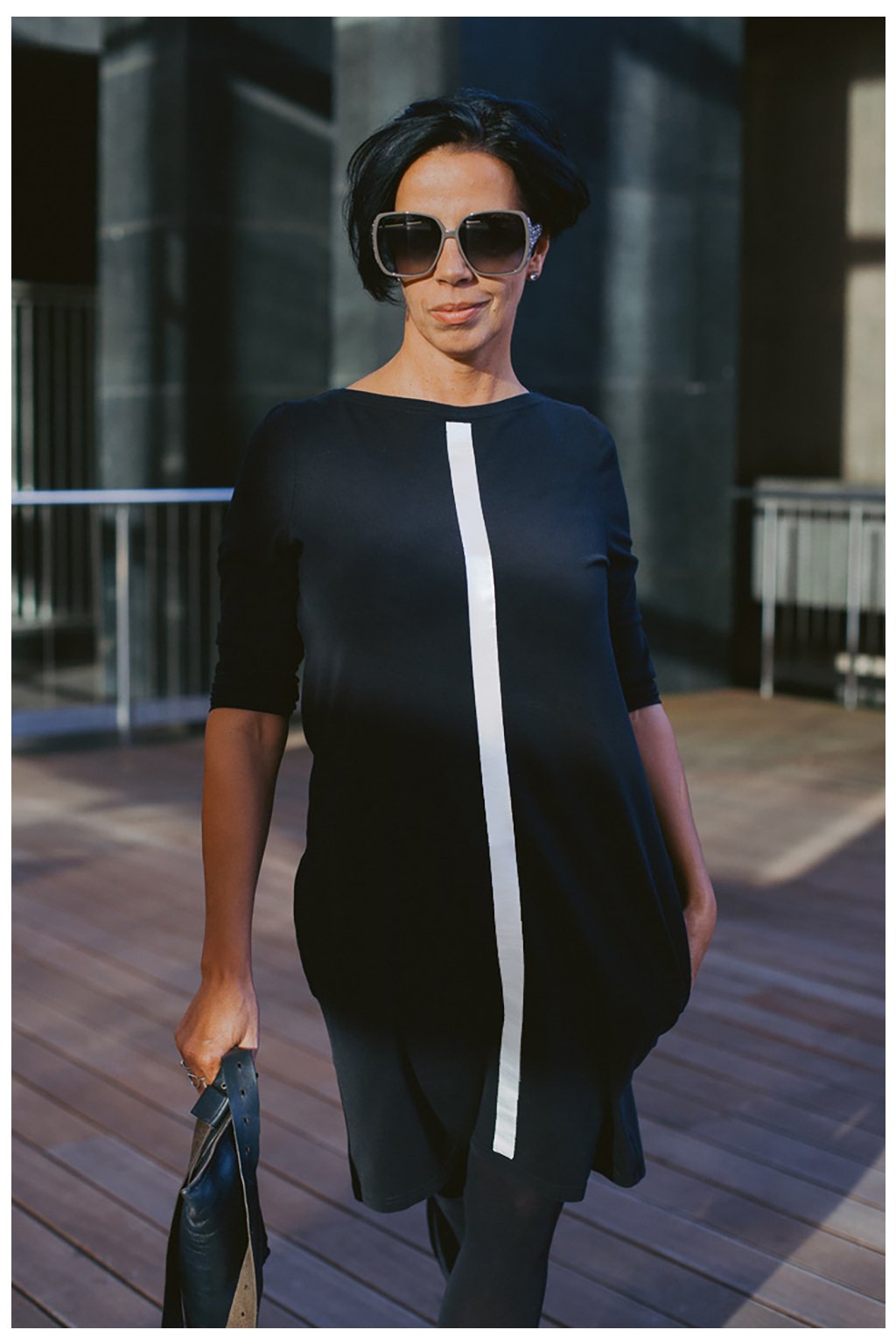 Šaty jsou rovného střihu, stejně široké v prsou a v bocích. Lodičkový výstřih. 3/4 všívaný rukáv. Boční kapsy.