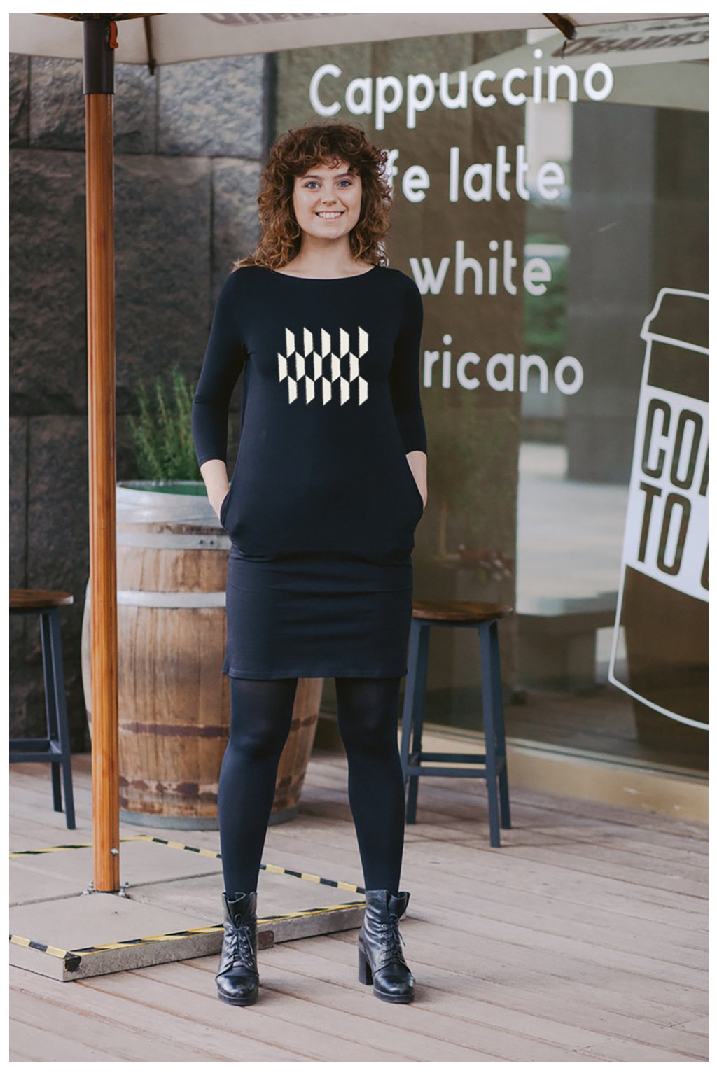 Šaty jsou rovného střihu, stejně široké v prsou a v bocích. Lodičkový výstřih. 3/4 všívaný rukáv. Boční kapsy.